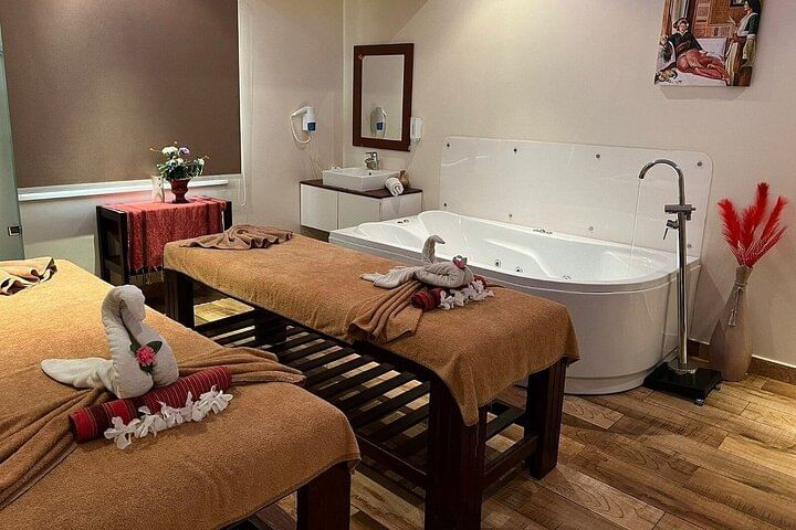 The Cleopatra Plus package offers a holistic wellness journey through the salt cave, steam room, jacuzzi, and includes a scrub, foam massage, coconut peeling, and a 45-minute massage.