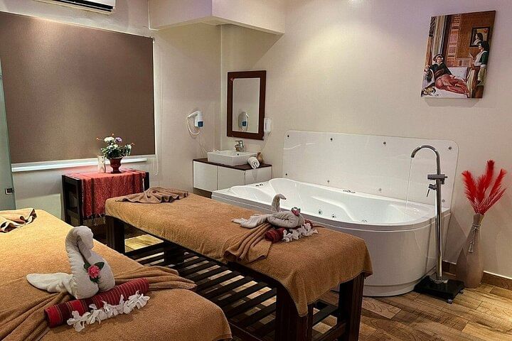 The Cleopatra Plus package offers a holistic wellness journey through the salt cave, steam room, jacuzzi, and includes a scrub, foam massage, coconut peeling, and a 45-minute massage.