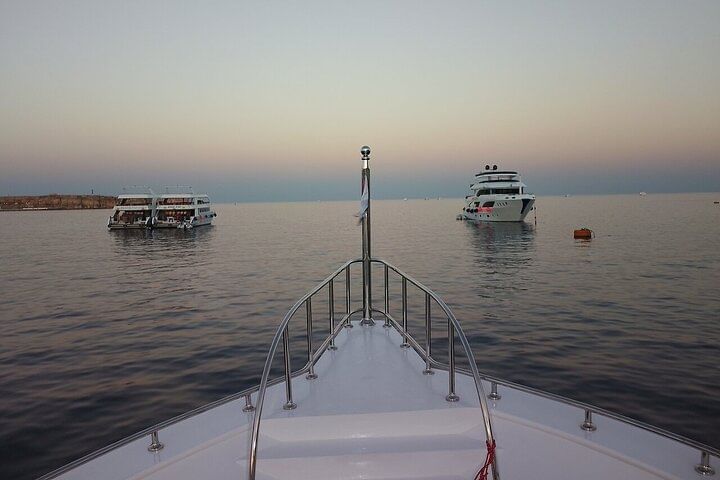 Indulge in a luxurious and romantic evening aboard a beautifully lit yacht. Enjoy a spacious and elegant setting as you cruise through the serene waters of the Red Sea.